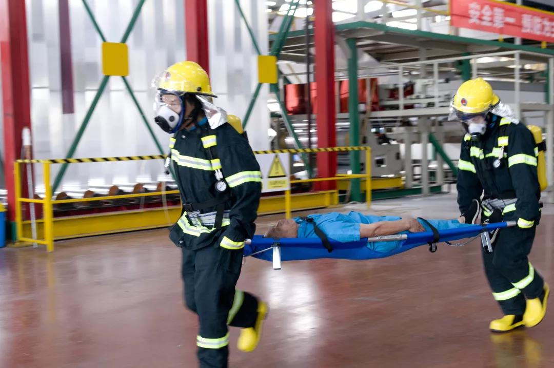 活動中,其應(yīng)急演練模擬場景以兩名員工經(jīng)過車間2#涂裝線RTO(廢氣處理設(shè)施)設(shè)備處,聽到檢查平臺上有的異響聲,員工登上RTO檢查平臺查看,登上平臺發(fā)現(xiàn)管路一處法蘭密封失效,天然氣從法蘭處大量泄漏,員工即試圖切斷泄漏法蘭前后處截止閥,操作不當(dāng)致靜電火花引起氣體燃燒。隨即兩人嘗試撲救火災(zāi)失敗,逃離過程中一名員工吸入大量天然氣暈倒在車間,另一名員工嘗試救助失敗后逃離車間展開現(xiàn)場逃生演習(xí)。員工在自救失敗后第一時間聯(lián)系車間主任,撥打119火警電話,同時啟動車間現(xiàn)場處置方案,指示車間兩名救災(zāi)人員穿戴消防服和SCBA救助受困人員,指派兩名救災(zāi)人員關(guān)閉車間天然氣閥門,并組織4#廠房全部人員立即有序撤離。