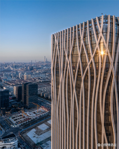 設計大師“樹”的設計理念突出體現(xiàn)在外立面幕墻。鋁幕線條從6層開始齊頭并進直至215米處,之后線條開始不規(guī)則地“開枝散葉”,使得前灘中心看起來更為靈動、生機勃勃。