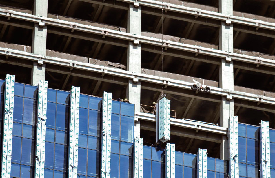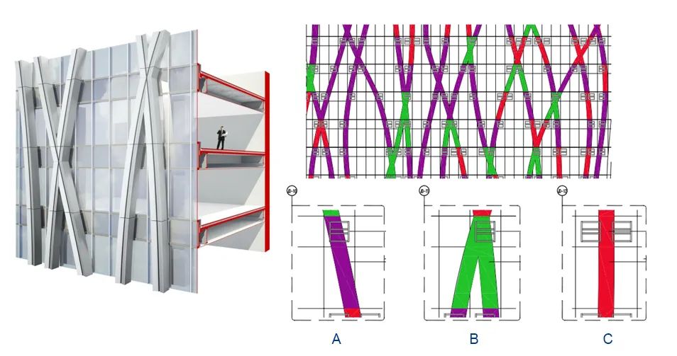 為追求水流的無序美感,塔樓頂端的鋁幕墻裝飾條均為不規(guī)則并伴有交叉的曲線。裝飾條轉(zhuǎn)角部位的鋁幕墻為工藝復雜雙曲面,項目中最大的一塊單元體線條,零部件數(shù)量超過100個單體,總面積達到19㎡,精度誤差要求不超過3mm,且安裝高度超過200米,制作和施工難度可想而知。