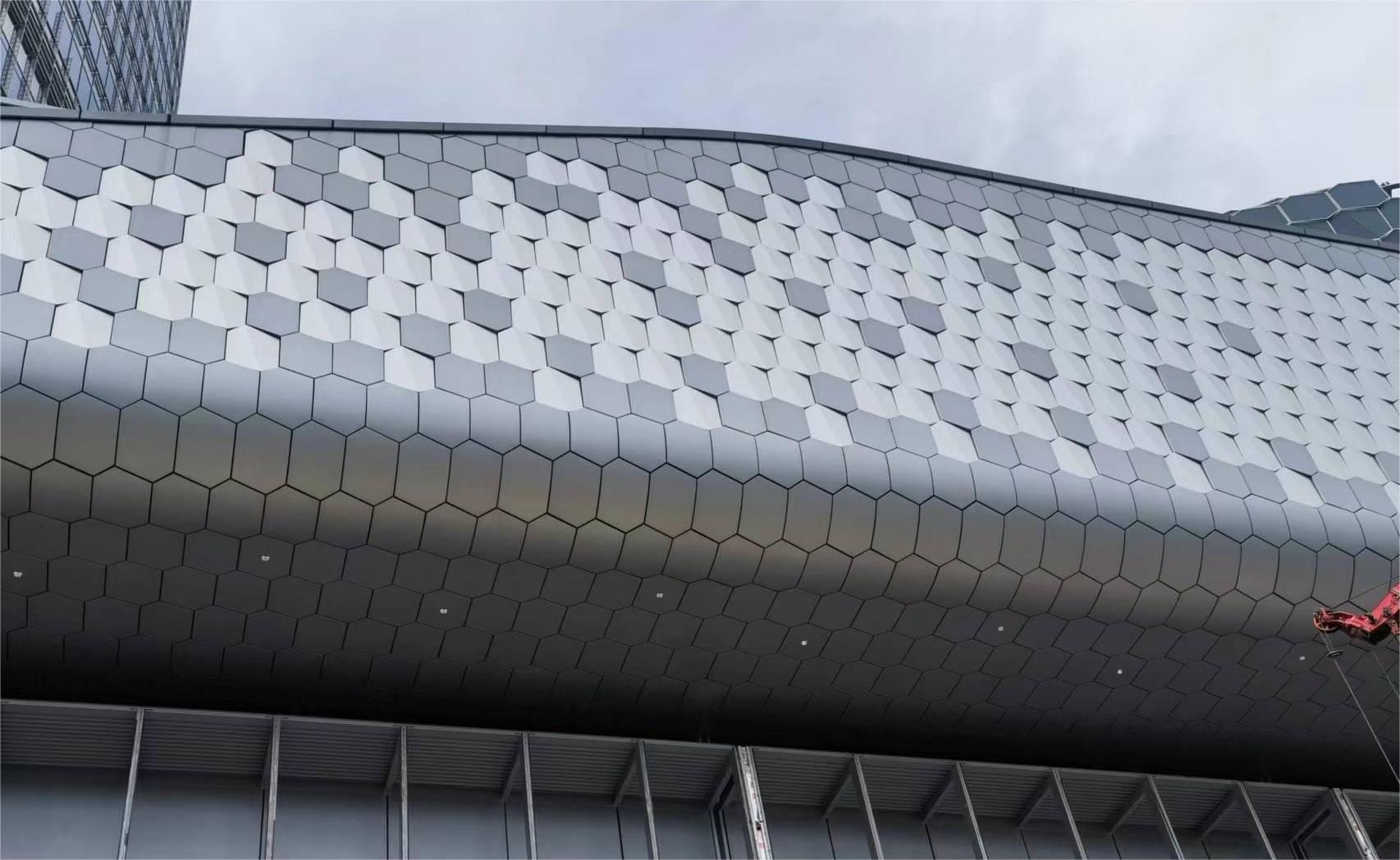 南裙樓船頭造型內(nèi)部鋼結(jié)構(gòu)均有扭轉(zhuǎn),要求拐角幕墻呈現(xiàn)雙曲面效果;屋檐幕墻設(shè)計(jì)圍繞龍鱗造型,分解為單片“六邊形”元素展開(kāi),拐角弧度造型對(duì)鋁板制造及安裝工藝要求極高。